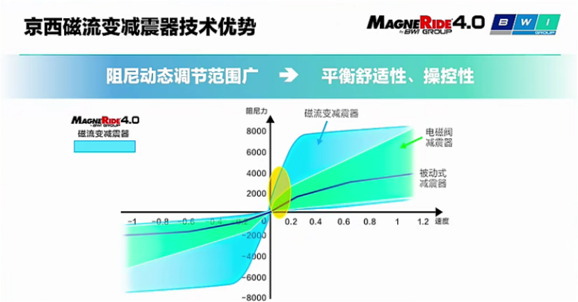 在性能表现上,磁流变减震器展现出显著优势:其阻尼调节范围远超电磁阀与被动减震器,尤其在活塞低速运动区间能快速建立阻尼力,从而更好地兼顾舒适性与操控性。实测数据显示,搭载磁流变减震器的车辆在操控性上明显优于电磁阀方案,舒适性则保持在同一水平。陈伟刚强调,该技术源自京西对德尔福底盘技术的传承,已历经四代产品迭代,拥有全球超1200万支的量产经验与140余项专利,技术成熟度已得到充分验证。