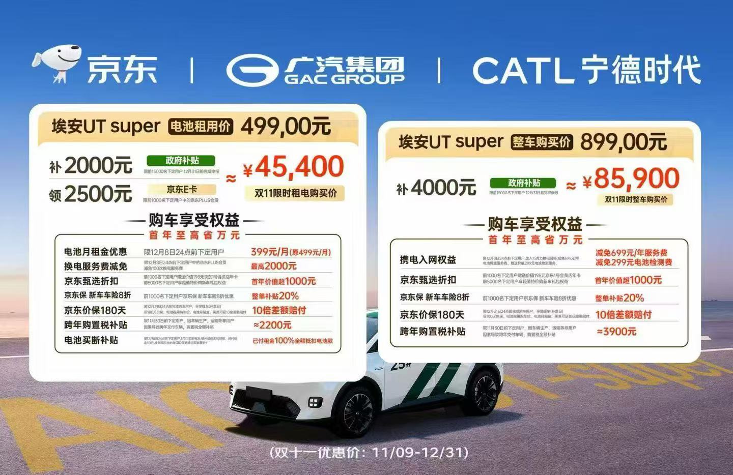 11月9日,“国民好车”埃安UT super正式发布,新车提供电池租用和整车购买两种方式,其中整车购买价为8.99万元,选择电池租用方案车价立减4万元,仅需支付4.99万(不含动力电池)即可提车,大大降低购车门槛。