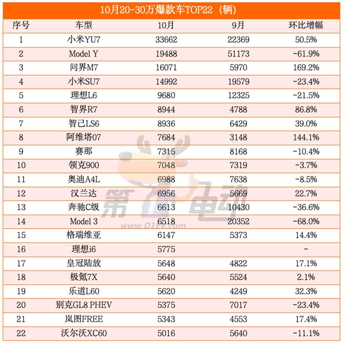 10月,新能源车集体爆发,TOP22榜单中,14款新能源车型贡献超15万辆销量,占比达75%,其中小米YU7 以33662辆登顶,成为该价位段首款单月突破3万辆的SUV车型,环比增幅高达50.5%;问界M7、阿维塔07、智界R7三款车型环比增幅均超80%,展现出强大的市场爆发力。