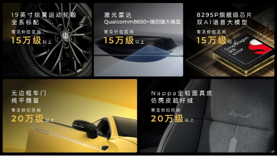 再加上其86%的同级领先得房率、超过80%的软包覆盖率、256色时光引擎氛围灯、哑光枪灰饰件、435L的后备箱容积、605km超长续航、高通8295P旗舰座舱芯片、激光雷达、端到端辅助驾驶等配置,空间、运动氛围、智能化等优势统统拉满。