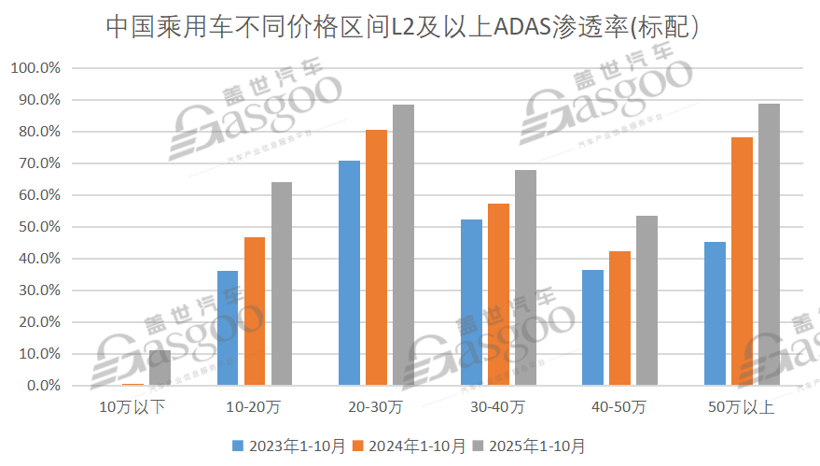相比之下,曾经的主流 L2 能力正进入“过渡期”。其渗透率在2024年触顶后略有回落,用户需求正从基础辅助转向更高阶体验:不再只关注“是否具备辅助驾驶”,而是转向对能力边界、场景覆盖度及稳定性体验的综合评估。这种趋势在产品端体现得更明显:10万以下车型从几乎零配置跃升至11.0%,10–20万区间提升至 64.0%,20 万以上车型普遍逼近 90%,高阶ADAS正逐渐成为主流车型的基础能力。高端市场同样快速补齐差距,50万以上车型的渗透率从45.3%提升至88.9%。整体来看,智能辅助驾驶正从“配置亮点”迈向“竞争门槛”,并推动市场向更智能、更体验导向的下一阶段演进。