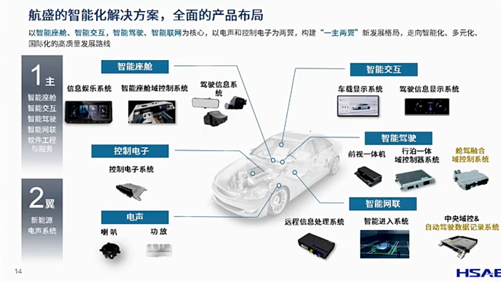 我们当前的业务布局可概括为“1主2翼”,“1主”涵盖智能座舱、智能交互、智能辅助驾驶、智能网联及软件工程五大产品线业务;“2翼”则包括新能源与电声系统两个子业务,共同构成全面的汽车电子业务板块。