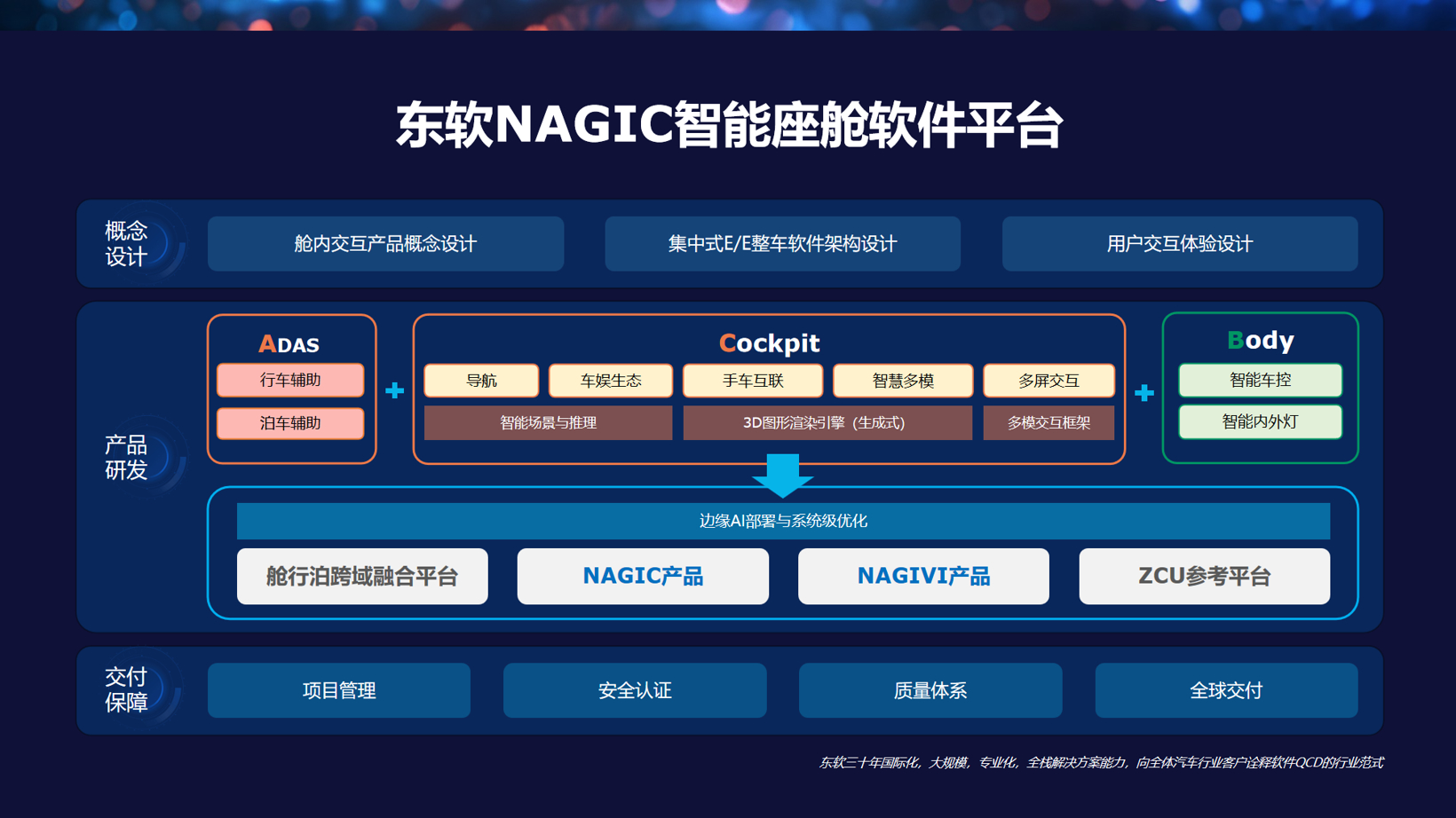 东软集团成立于1991年,自创业之初便深耕汽车软件赛道,至今已拥有三十五年研发经验。其汽车智能软件事业部于2015年完成产品化转型,推出的NAGIC全球智能座舱软件平台已历经十年迭代与超300万辆车的量产验证。东软拥有超过6000名汽车软件工程师,形成了“技术线 产品线 项目组”的多维战队,具备从产品设计、研发到全球交付的全栈解决方案能力,致力于为全球汽车客户提供稳定、可靠且前沿的汽车软件产品与服务。