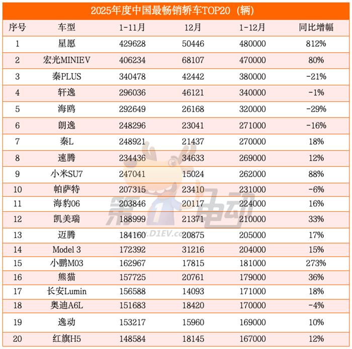 以下2025年度最畅销轿车TOP20为预估量,与明年1月中旬披露的零售量会略有出入。不当之处,请批评指正。