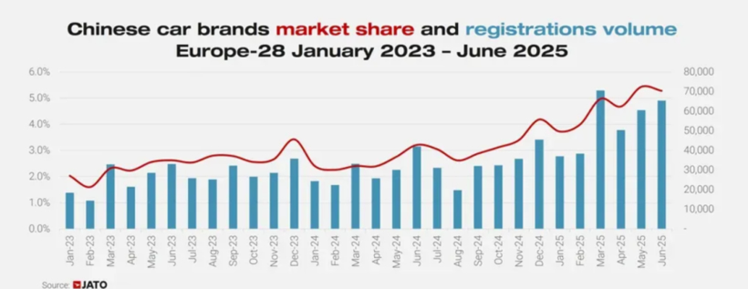 2025年11月,在欧盟 EFTA 英国25个主要国家(覆盖欧洲97.5%的汽车市场),中国品牌乘用车销量达7.8万辆,同比激增109.2%,创下历史新高;前11个月累计销量达68.7万辆,同比增幅高达96.5%,而同期整个欧洲乘用车市场的整体增幅不足2个百分点,形成鲜明反差。