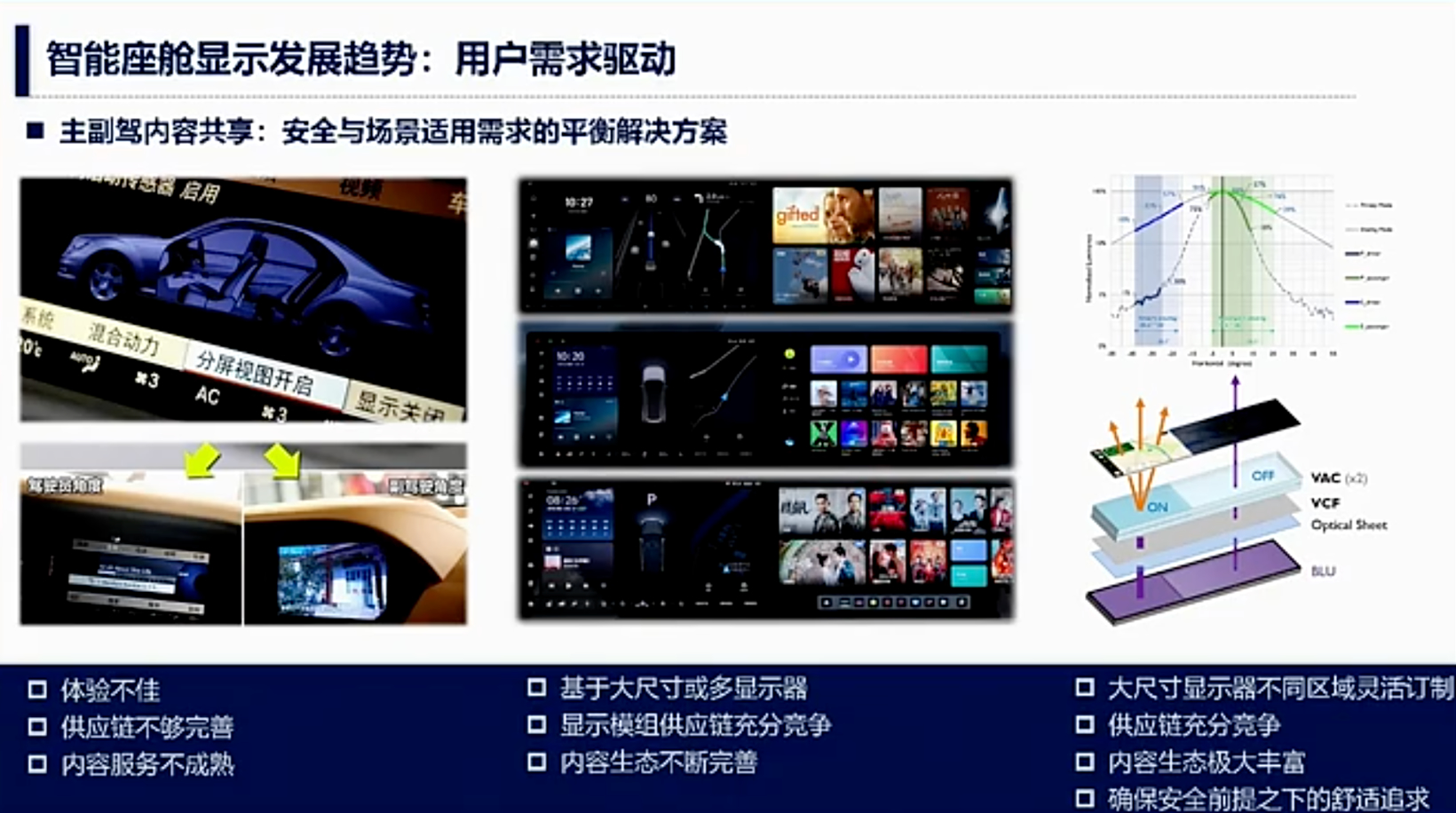 这里举一个有趣的例子。分屏显示并非新颖技术,可通过柱状透镜或偏光片实现分屏视图的开启,涵盖被动与主动两种方案。大约10年前,部分主机厂开始采用此类方案,且诸多Tier 1或Tier 2供应商亦能提供相应解决方案。然而,彼时该技术存在诸多缺陷,例如分屏使用时分辨率至少降低一半,且供应链尚不成熟,导致成本上升,无论是对于一级供应商还是主机厂,通常都难以承受。