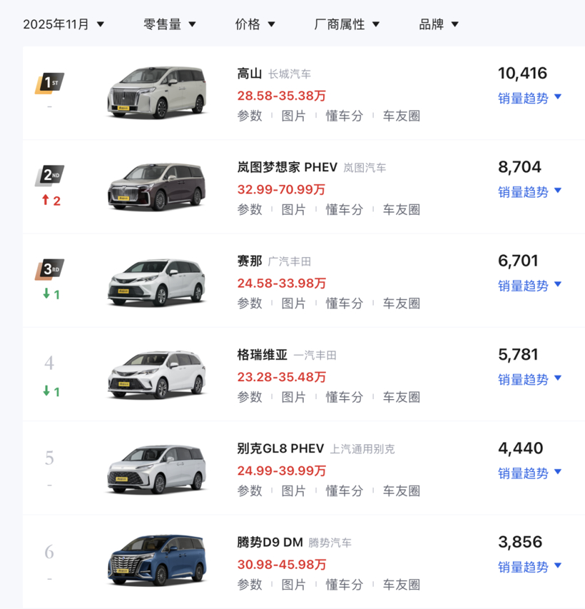 2025年,一股强劲的“分流”力量悄然袭来:大六座SUV阵营的集体爆发,开始蚕食原本属于MPV的市场份额。这导致曾经动辄月销破万的明星MPV车型,销量开始呈现增长乏力之势。例如,今年11月MPV销量榜单中,仅榜首的魏牌高山销量破万,紧随其后的岚图梦想家、丰田塞那和别克GL8只能在万辆以下的空间内展开搏斗。