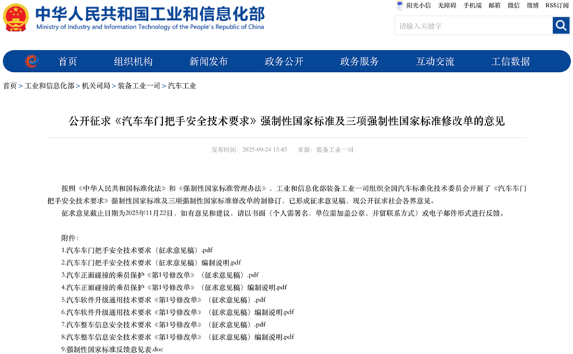 9月24日,《汽车车门把手安全技术要求》征求意见稿正式完成,其中提出多项技术细节,如所有车门 (不含尾门) 必须同时配备具备机械释放功能的内、外门把手,令车辆即使在电子系统完全瘫痪时,车门仍可通过机械方式开启;车门外把手在任何状态下必须预留手部操作空间,确保紧急情况可操作。
