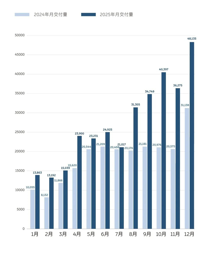 对此,在李斌眼中,“肯定是距离预期差一点,背后有很多原因。不过,总的来说,也算达到了我们的战略目标。尤其是从2025下半程开始,从谷底进入到了第三个高速增长阶段。大家如果看交付量,基本从5月、6月之后便持续提升,到8月、9月开始创造新高,再到12月冲到4.8万辆,基本都是不断向上的姿态。”