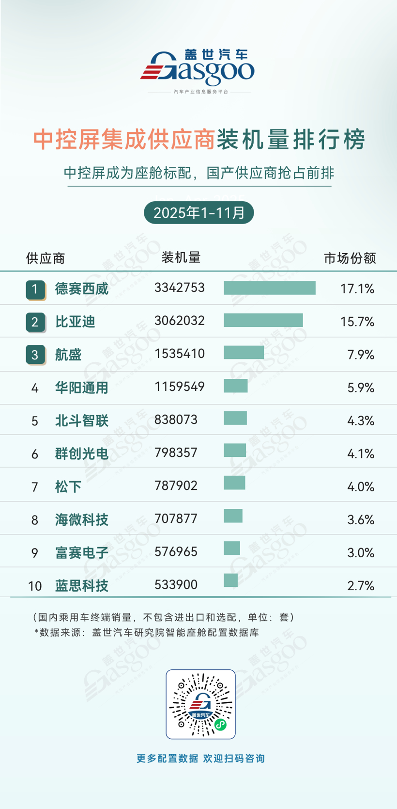 德赛西威,2025年1-11月装机量3342753套,市场份额17.1%。