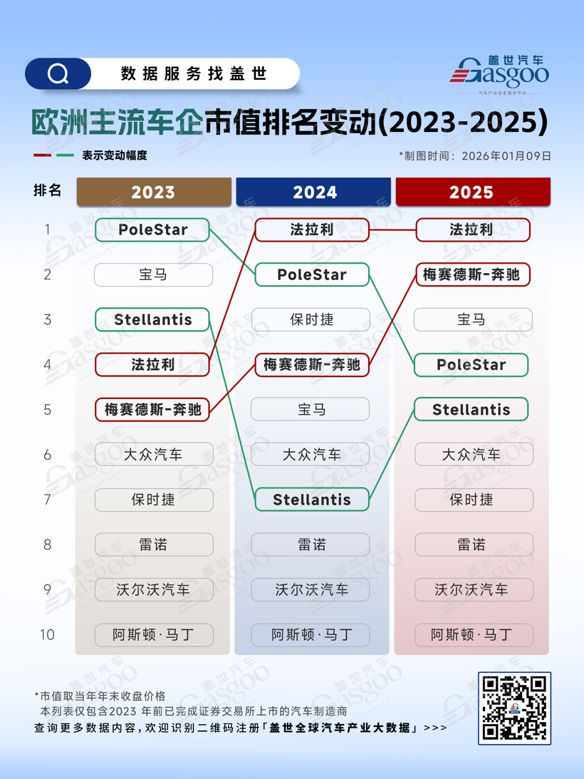 欧洲市场的调整主要体现在“豪华品牌与新势力竞争”上:法拉利在2024年取代PoleStar登顶,并延续至2025年,高端市场消费韧性支撑其市值稳定;PoleStar从2023年第1名下降至2025年第4名。梅赛德斯-奔驰排名回升(2025年第2名),说明传统豪华品牌在电动化、智能化转型上取得初步成效。