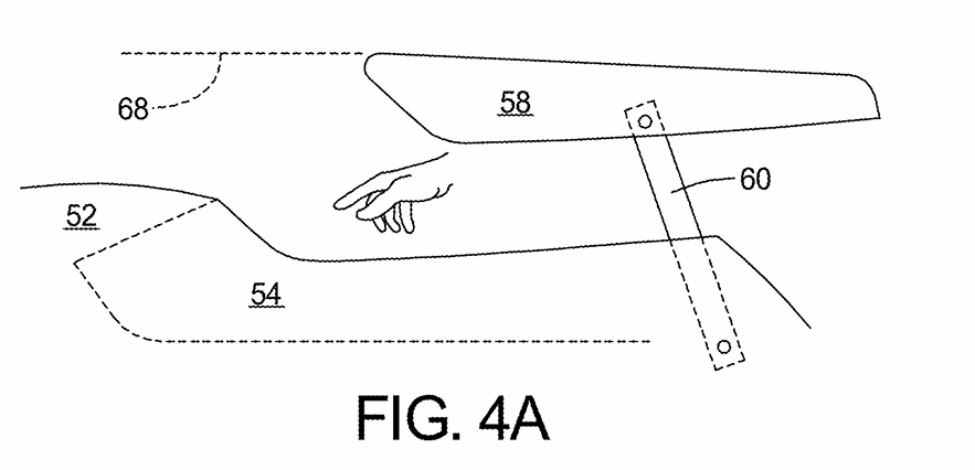 在下降位置时,扶手直接置于中控台的顶部,并覆盖储物格开口。此时,扶手还可以锁定到位,有助于保证中控台内存放物品的稳定。在上升位置时,扶手升至中控台上方,从而完全打开下方储物格。该专利还描述了扶手完全抬起和完全放下之间的中间位置,处于该位置时,扶手始终有所支撑并保持水平。