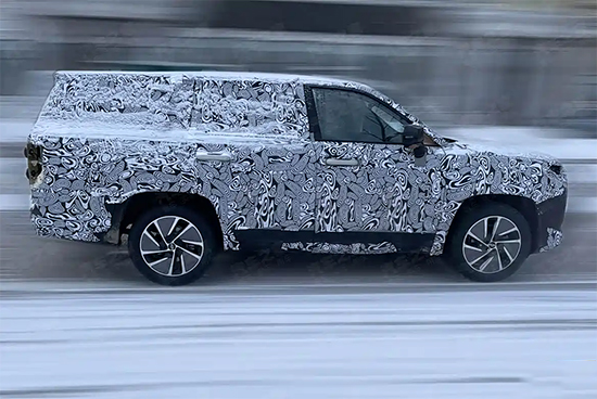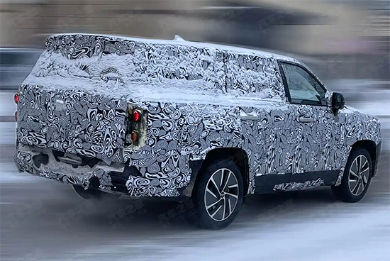 参考此前曝光的效果图,新车将配备双色车身,银色的C柱装饰将前后两部分区隔开,有效削弱了全尺寸SUV的蠢笨感。同时,车尾配备天地门,后包围处还留有脚踏板设计,与谍照车型一致。