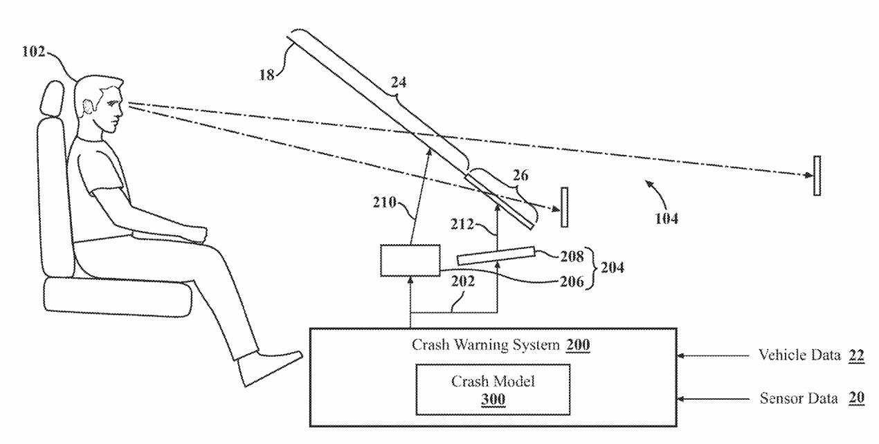 如果系统检测到即将发生碰撞的风险,它会生成图形警报,并通过抬头显示器显示。该警报会投射到挡风玻璃上,以便驾驶员在专注于前方道路的同时也能看到。根据专利描述,该警报可以指示接近物体的方向,并可使用增强现实叠加技术显示。