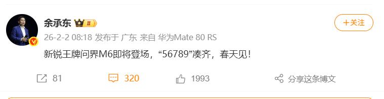 2月2日,华为常务董事、终端BG董事长余承东发文宣布:新锐王牌问界M6即将登场,“56789”凑齐,春天见!