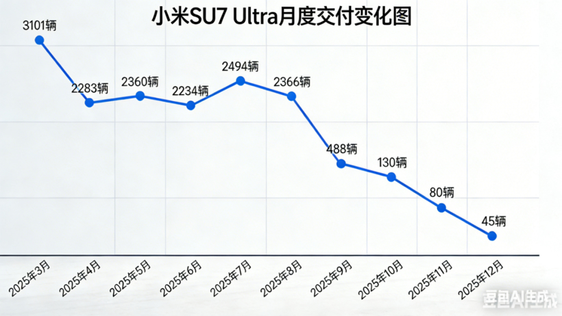 目前看来,有且仅有一个原因,小米SU7 Ultra的销量属实养不起专属销售团队,其2025年12月总销量仅为45台,相较于上市时的开售10分钟大定突破6900台,可谓云泥之别。