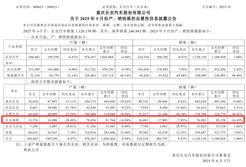 长安汽车最近一次公布的长安福特产销快报数据显示,2025年前五个月,长安福特累计销量约7.7万辆,同比下滑16.43%。从2025年6月至今,长安汽车都没有再公布长安福特的具体销量数据。