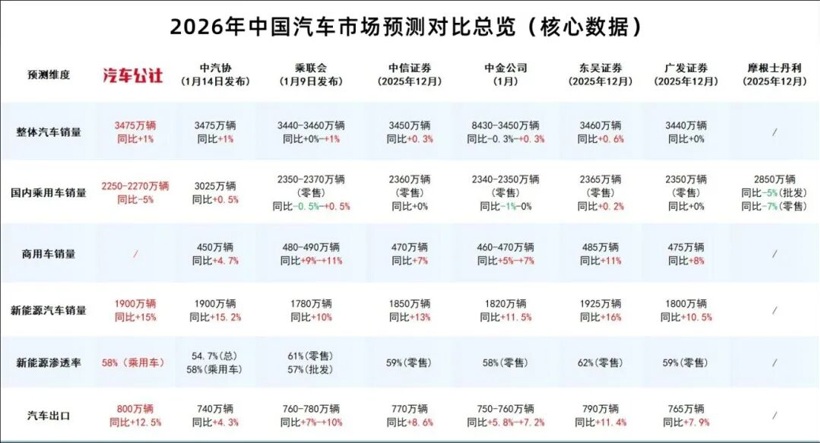 国内机构的预测一如既往地相对乐观。乘联会预测2026年预计国内乘用车零售销量约2400万辆、同比 1%;新能源乘用车零售量约1460万辆增13%、渗透率61%。中国汽车工业协会(中汽协)于1月14日发布预测:今年汽车总销量预计3475万辆,同比微增1%,其中乘用车(含出口)3025万辆,同比微增0.5%。