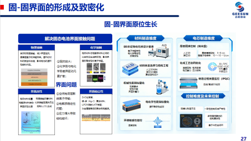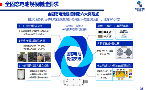 固态电池的装备研发涉及多个方面。干法混合和连续成膜是实现大规模生产的关键,固态电解质独立成膜且无孔隙是离子传输的理想状态。卷对卷成膜技术、连续制造方法以及智能化成等都是提升生产效率和质量的重要方向。例如,复合叠片技术可实现800 - 1000PPM的效率,一台设备可达2 - 4GWh,这对于大规模生产具有重大意义。