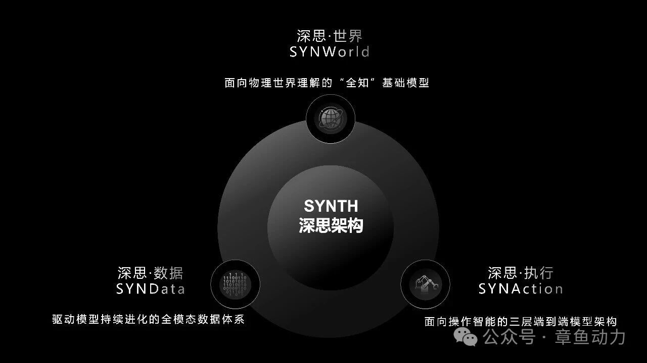 具体到SYNTH深思架构,包括面向操作智能的模型架构深思·执行SYNAction,面向物理世界理解的“全知”基础模型深思·世界SYNWorld,以及驱动模型持续进化的全模态数据体系深思·数据SYNData。