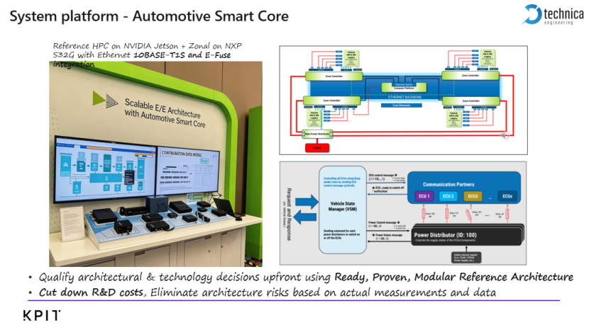 在硬件与系统平台层面,KPIT打造了名为“Automotive Smart Core”的实体参考平台,并已在CES等国际展会上进行展示。该平台集成了NVIDIA Jetson系列的高性能计算单元与NXP S32G系列区域控制器,形成了覆盖中央计算与区域控制的硬件骨架,同时集成了车载以太网10BASE-T1S和智能电子保险丝等关键部件。