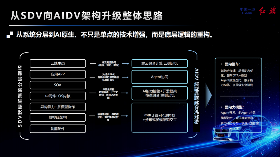 与此同时,舱驾融合成为突破智能化瓶颈的关键。过去,座舱与智驾相对独立,导致感知分离、语义割裂,甚至在大模型并行运行时产生资源抢占。解决之道在于从硬件、模型到交互的全面融合。通过构建统一的“世界模型”,将座舱感知的车内场景与智驾感知的车外场景进行联合标注和统一训练,使模型能够全局感知、统一决策。一汽红旗的实践路径正沿着这一方向演进:从将AI作为应用层的外挂能力,到当前SDV与AIDV的融合阶段,最终目标是实现完全的“去APP化”,让AI Agent成为交互主场景,通过多Agent协同管理车控、生态和智驾等服务。