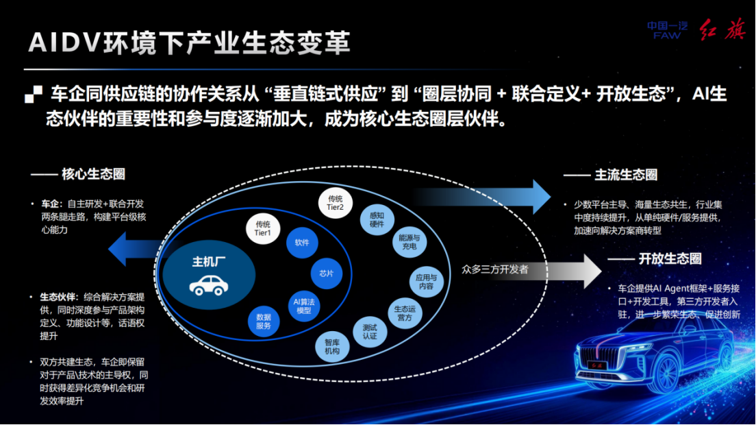 在产业生态层面,车企与供应链的协作关系正从传统的“垂直链式供应”向“圈层协同”转变。随着AI定义汽车时代的到来,单一车企难以包揽所有核心技术,需要与AI生态伙伴进行更深度的联合定义与开放协作。一汽红旗正通过构建以“为你而生,牵引万象”为价值主张的红旗智能灵犀座舱,基于端云融合的全模态智能体架构,将舱内外的硬件设备、感知体系和云端生态服务打通,为用户提供从出行、娱乐到陪伴、控车的全场景沉浸式体验。在这一进程中,车企保留产品主导权的同时,与生态伙伴共同构建差异化竞争力,将成为未来产业竞争的新常态。