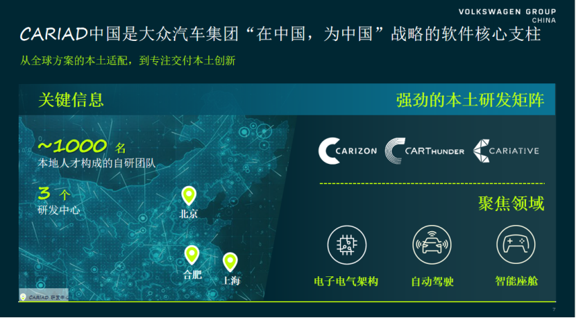 为支撑这一战略转型,CARIAD中国在组织层面进行了重大布局。目前,已在北京、上海、合肥三地建立了研发中心,组建了由约一千名本地人才构成的自研团队,专注于智能座舱、高级辅助驾驶及电子电气架构三大核心领域。这不仅强化了本土研发实力,更是为了将决策与开发前置,更敏捷地服务于中国市场的独特需求。