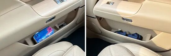 对于车内使用空间的测试,只针对前排触手可及的空间,不包括手套箱、中央扶手箱等需开启的空间。测试方法是将以下固定物品全部放置在前排的各个储物空间内,通过固定物品的放置情况来判断车辆储物空间的表现。测试选定的固定物品为:2瓶常规大小的矿泉水、1部大屏手机、1支口红、1个挎包、1副墨镜、1把折叠雨伞以及1包常规尺寸的抽纸。