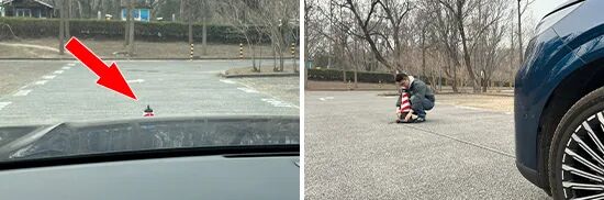 在前方视野测试中,我们采用高70cm的桩桶作为参照物,随后调整车距,直至在主驾驶位可以看到桩桶上沿。经过测试,桩桶与车头最终测得的数据为3.356m,在测试过的同级别车型中处于中游水平。