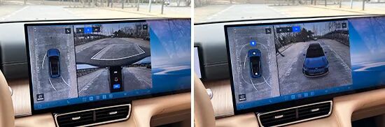 评测车配备360度全景影像,并配有可随动转向的倒车辅助线,能够减轻泊车时的压力。经实测,整体画质清晰且无畸变。