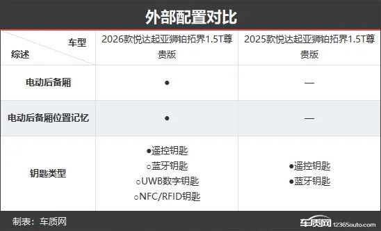 外部配置方面,新款车型相比老款车型有升有降。其中,新增的电动后备厢及电动后备厢位置记忆功能,能在日常用车中为车主带来更多便利;但在钥匙类型上,老款车型配备的蓝牙钥匙在新款车型上变为选装,但后者还可额外选装UWB数字钥匙和NFC/RFID钥匙,为车主提供了更丰富的选择。