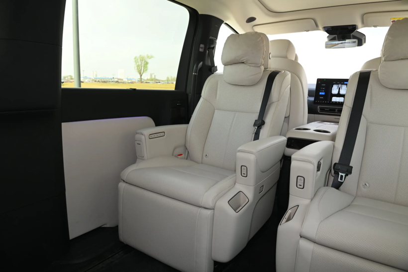 靠着“四轮四角”的结构、纯平的车内地台、1.35米高的车内高度以及两米的长滑轨,此前我们在体验这款车时就感受到了它这个有些离谱的车内空间。