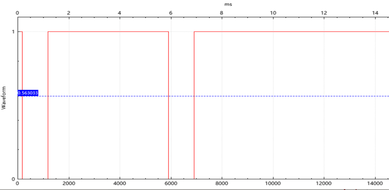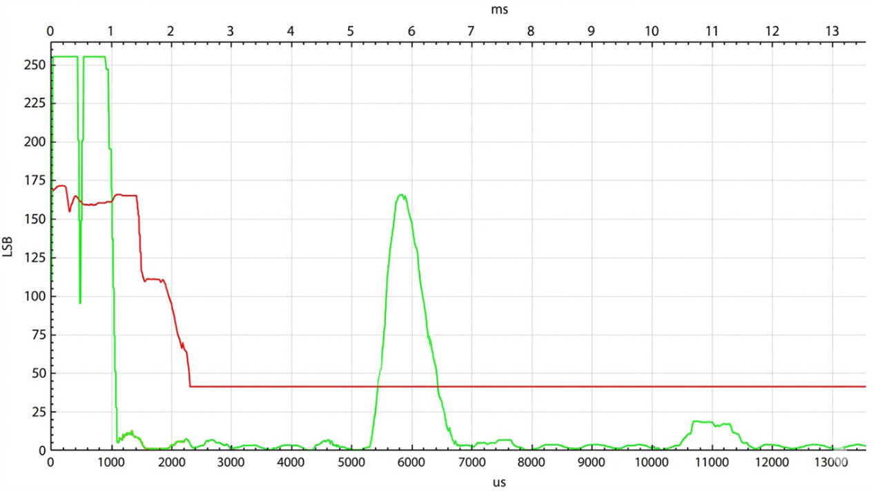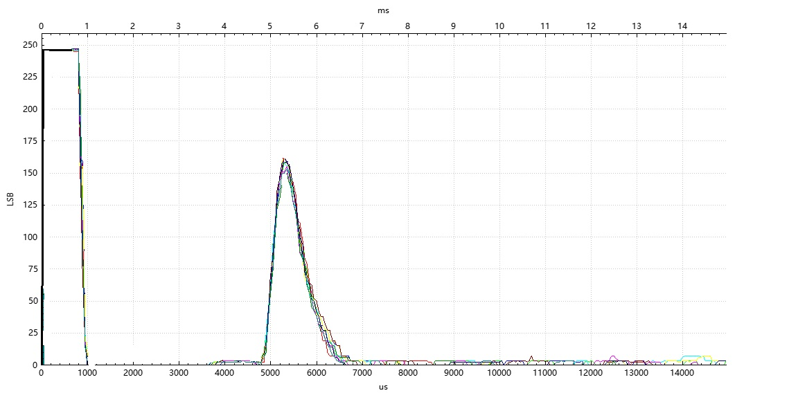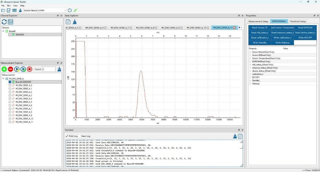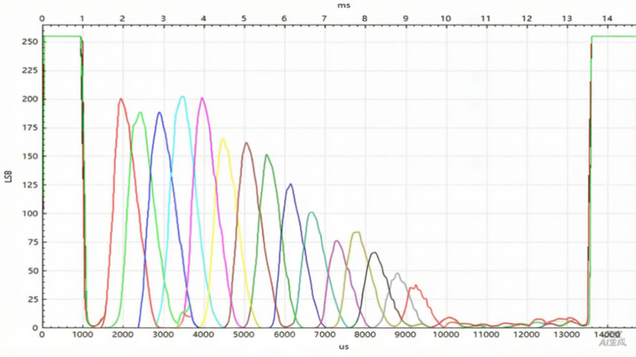 传统方案在发生余震分裂时,芯片会误将分裂后的残余信号识别为真实障碍物,导致频繁误报。产线端不得不花费大量时间对每颗探芯进行筛选,良率与效率双双受损。TCAU33采用自有专利检测与处理技术,从根源上消除余震分裂带来的误判风险,无需任何产线筛选,大幅提升生产直通率。下面图4的示例显示了一个典型的余震分裂包络曲线,其中包含一个回声和用户设置的阈值曲线,可以看到在图5 TCAU33的IO口上的测距脉冲波形,近距离余震分裂阶段没有触发误报,准确地探测到了远距离的目标。
