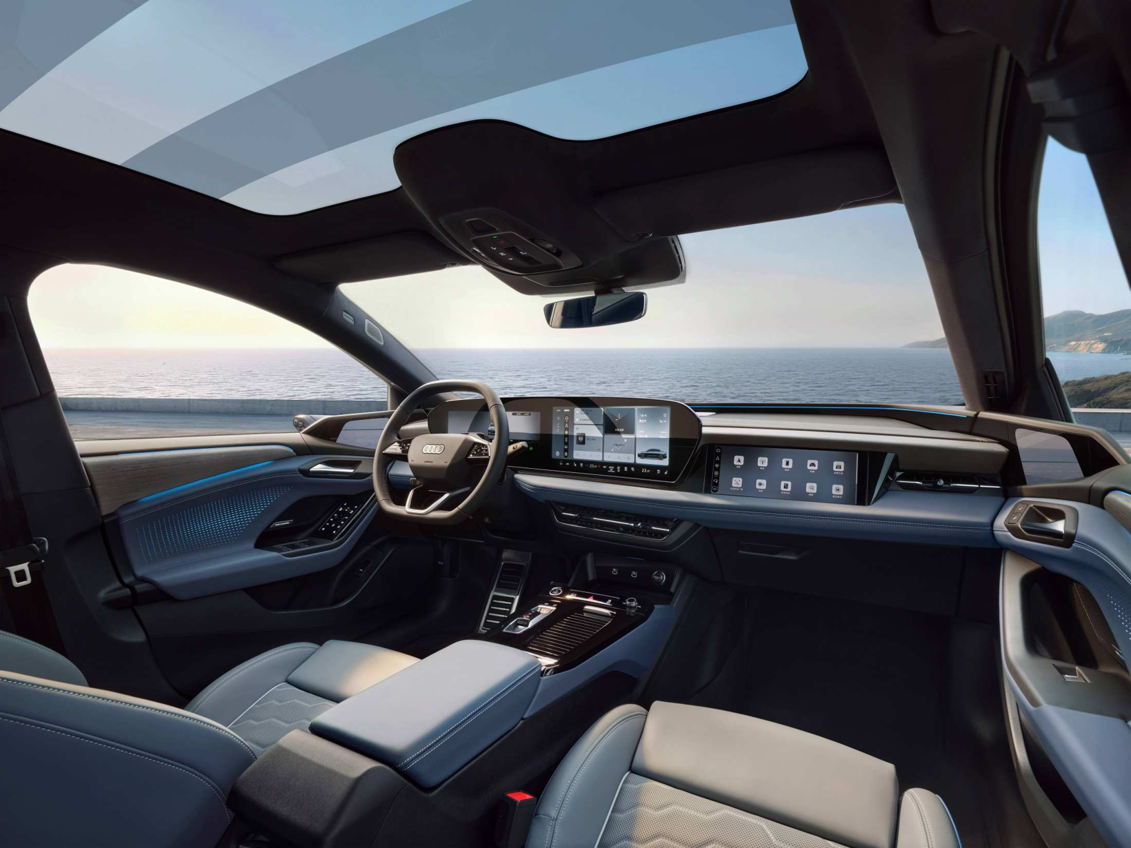 奥迪A6L e-tron搭载了多项舒享配置,构建高品质的豪华私享空间。坐进车内,首先感受到的是专为东方人体身型定制的“云感座椅”,采用Laedana环保耐磨材质打造,兼具细腻触感与实用环保;前排通风、加热、按摩功能一应俱全,后排更配备专属颈部头枕,为全部乘员提供舒适体验。车内搭载的丹麦Bang & Olufsen 豪华音响系统,以20个高性能扬声器精准排布,还原清澈悦耳的细腻音质,打造沉浸式听觉盛宴,而车辆噪音补偿技术则强效过滤外界杂音,尽享静谧豪华。此外,抬头可见的1.88m²超大九分区可调光全景天幕,拥有99.9%的超高紫外线隔绝率,搭配毫秒级响应调光功能,为座舱赋予光影与视野的自由掌控。