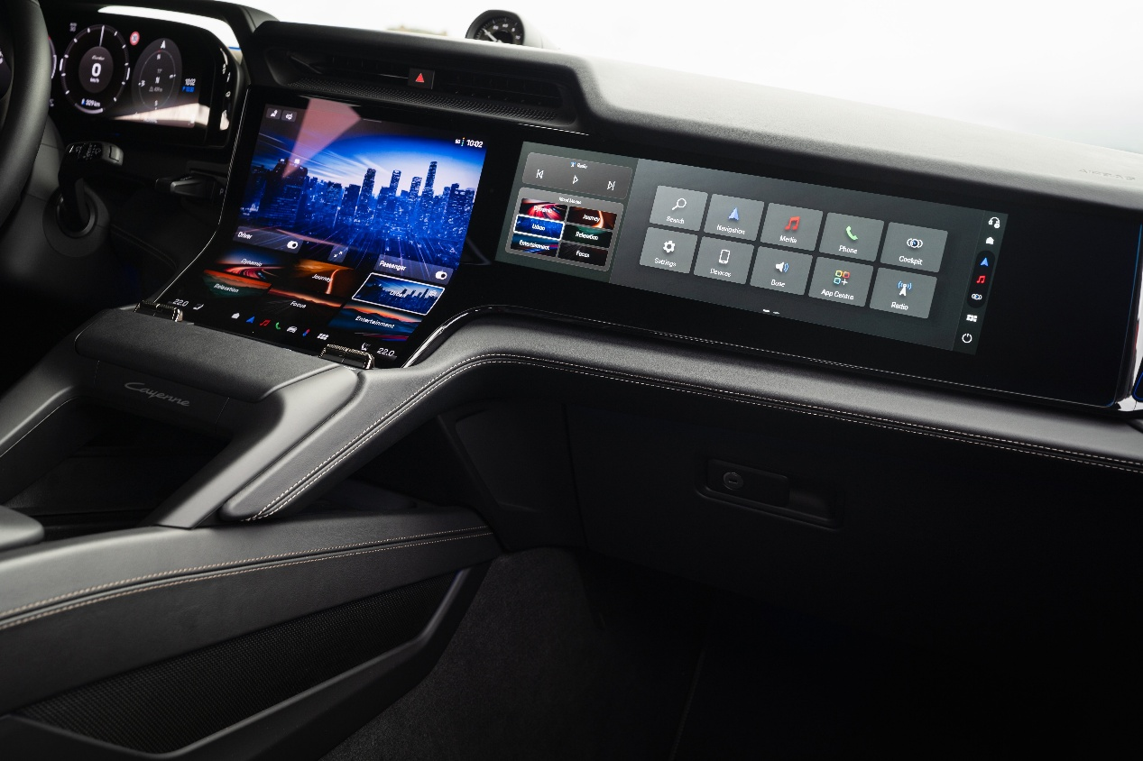 • 首创流动中控屏Flow Display:驾驶者为中心的创新数字座舱体验全面升级,12.25英寸OLED流动中控屏,中控屏显示面积较燃油版Cayenne增加50%。