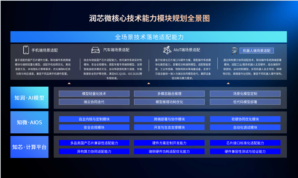 这一多元产品矩阵的背后,是润芯微成熟的系统工程能力与技术复用逻辑。依托“知芯 知微 知润”三大技术基座,企业实现底层硬件抽象层、AIOS内核、端侧AI模型的统一共享,将车规级高稳定性、强实时性、高安全合规能力,平滑迁移至机器人、工业、两轮车等更多场景,真正达成“一次研发、全域复用”。