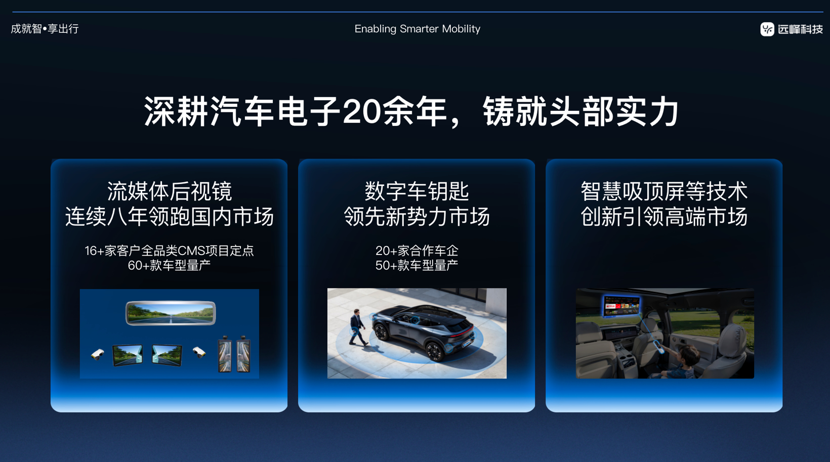 目前远峰科技流媒体后视镜以超70%的市场份额稳居国内第一;在国内数字钥匙系统集成商领域,剔除车企控股供应商后,远峰科技数字车钥匙市场份额位列第一。未来,远峰科技将把流媒体后视镜、数字车钥匙、智慧吸顶屏等更多智能创新产品带给全球用户。