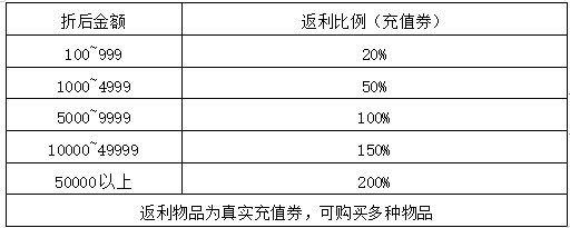 活动规则:返利计算金额为rmb充值折扣后金(计算方式为折后,例如购买4998元礼包,折后支付49.98元,计入返利的金额为49.98)