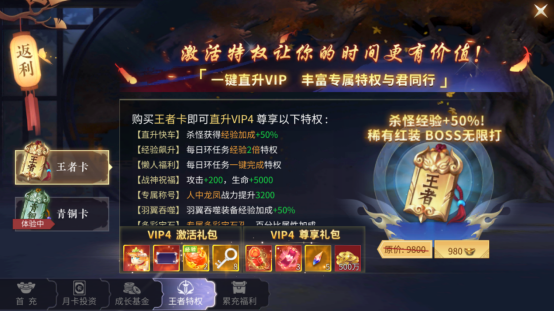 3、王者特权,懒人党必备。每天可以轻松升级、过任务。还有专属称号,经验加成,性价比也不错