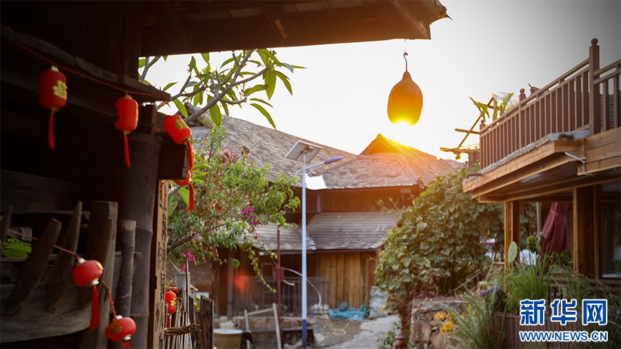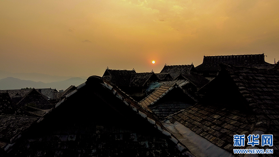 落日余晖下的云南普洱翁基古寨一角(4月1日摄)。新华网 徐华陵 摄