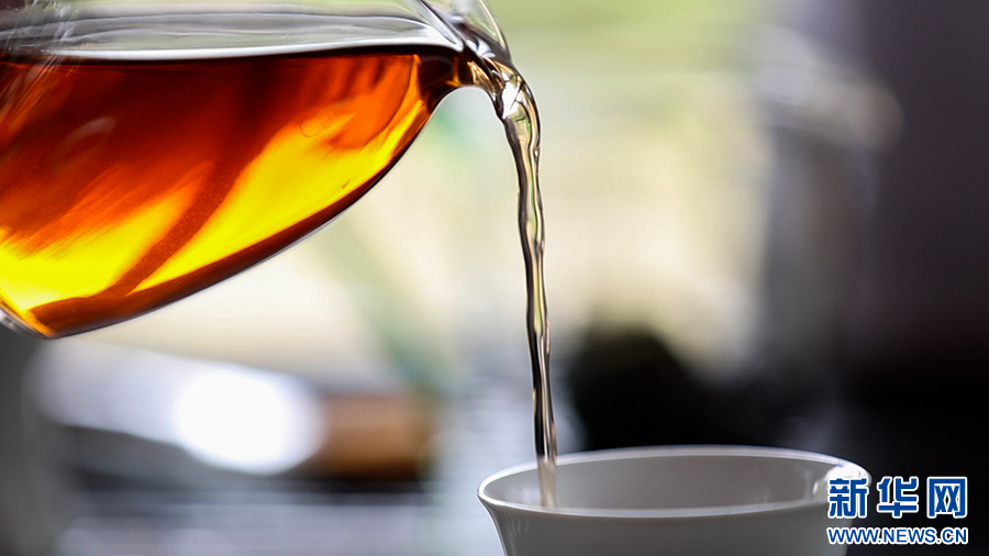 云南普洱翁基古寨,当地人正在泡茶,茶汤清澈(4月1日摄)。新华网 徐华陵 摄